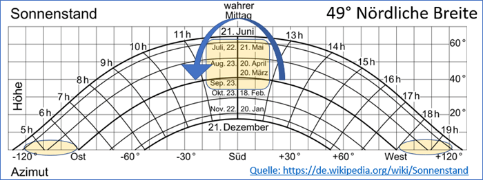 Der Montageort des Sensors wird in unseren Breiten üblicherweise im Norden eines Gebäudes gewählt. Allerdings überstreicht die Sonne von 20. März bis zum 23. September weit mehr als 180° (siehe Abbildung 2). Deshalb wird ein Sensor in der Früh und am Abend auch auf der Nordseite von der Wärmestrahlung der Sonne getroffen und erwärmt.