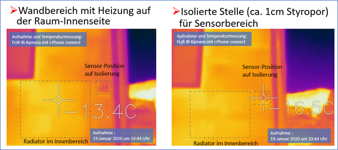 Im gezeigten Beispiel (Abbildung 4) handelt es sich um eine Infrarot (IR)-Aufnahme einer Hauswand bei einer Außentemperatur von fast minus 20°C. Es sind zwei umrandete Bereiche gekennzeichnet, links ein Bereich, auf dem auf der Innenseite ein Heizungs-Radiator montiert ist, und rechts ein kleinerer Bereich, der durch ein dünnes Styropor-Stück (ca. 1cm) zusätzlich isoliert wurde. Die gemessene Temperaturdifferenz beläuft sich auf mehrere Grad Celsius zwischen dem Bereich des Radiators und des isolierten Bereichs. Ein Temperaturunterschied von 3°C macht für die Regelung bei diesen Temperaturen sehr viel aus. Deshalb ist eine großflächige Isolierung des Sensors gegen die Gebäudewand insbesondere im Altbau unbedingt anzustreben.