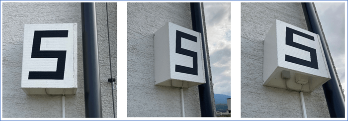 In Abbildung 6 ist unser Prototyp Version 2.1 dargestellt. Dabei handelt es sich um eine L-förmige Abschirmung zum Gebäude und zu einer Himmelsrichtung hin. Beim Verbau von 2 solcher Abschirmungen, die gegengleich selbständig und mit Eigenmitteln miteinander verschraubt werden, ergibt sich eine beidseitige Abschirmung nach Osten wie nach Westen hin. Eine Hausnummer wie in Abbildung 6 oder andere Aufdrucke können selbst aufgebracht werden.
